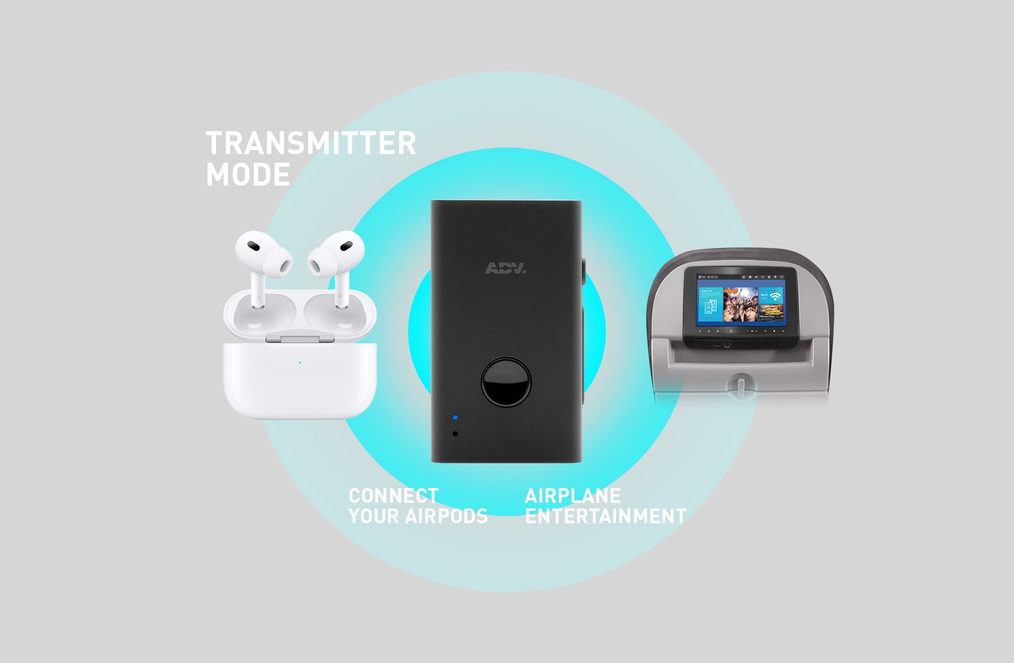 Connect to airplane entertainment system which allows wireless connection to your AirPods or other wireless headphones.